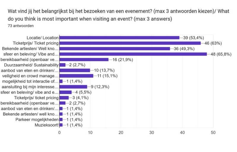 I felt very excited for this research because I felt like it was very valuable to me and the results are effective for me to use when thinking about organising an even t but also for my internship in Limburg. I was very motivated by how relevant this is research is for event planning and how it could improve my practical research skills. However I was unsure whether I would be able to collect meaningful, consistent information. This because I had already sent out so many surveys I expected people to ignore this one. To my surprise I received 70+ answers which was more than the other surveys. The survey provided great insights, the structured nature of survey allowed for clear, focused data collection. I also found that people liked to share their event preference. I think perhaps I could have added even more questions but was held back by thinking people wouldn't answer the survey if it became more.